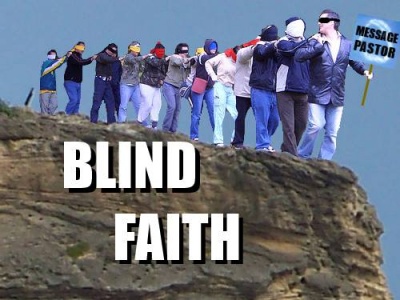 Some message believers look at the evidence of [[Failed Prophecies]] that we and others have presented and state "You just don't believe" and then advocate a kind of "blind faith" that requires true believers to ignore any negative evidence. | Some message believers look at the evidence of [[Failed Prophecies]] that we and others have presented and state "You just don't believe" and then advocate a kind of "blind faith" that requires true believers to ignore any negative evidence. | ||