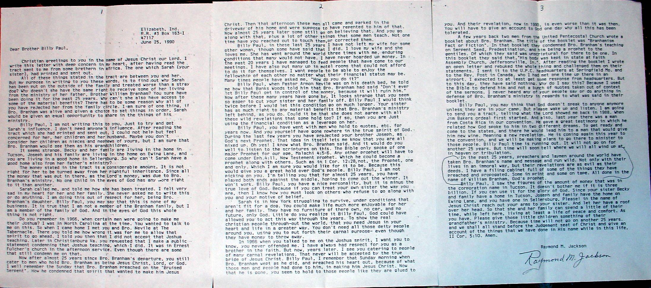 Letter to Billy Paul Branham from Junior Jackson regarding Sarah Branham